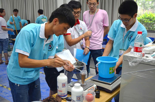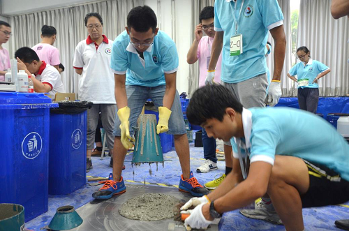 下午13:00,令人期待的实际操作比赛终于拉开帷幕,该部分为现场混凝土配合比设计、拌和及性能测试。学生们一边拿起计量器认真配比,一边抄起铁锨搅拌砂石,场面非常热闹。本次大赛设计主题是“C30大流态混凝土”。技术评议组和裁判组将根据配合比设计的合理性、现场拌和操作的正确性、拌合物的工作性进行评分。