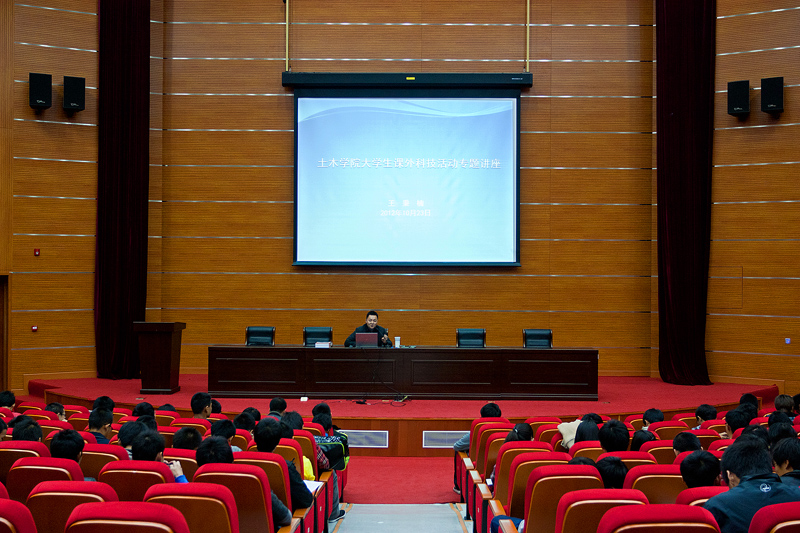 2012 年10月23日,土木学院于基础教学楼A座报告厅举办新生入学教育系列讲座——大学生课外科技活动专题讲座。该讲座由土木学院团总支书记王秉楠老师主讲,土木学院12级、11级学生及辅导员刘倩老师参加了本次专题讲座。