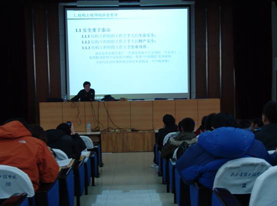 许副总工程师以三个问题作为讲座的开头:今后做什么?设计?施工?管理?还是根本不打算从事本专业;问问自己能干什么?能为社会提供什么;这四年学到了什么。为即将毕业的本科生说明了毕业设计的重要性,并强调要以毕业设计为主线,把这四年里老师给的知识珍珠穿成一条项链。接着徐副总工程师从结构工程师的社会责任;工程灾难实例;结构工程师的发展前景;结构工程师基本素质;做一名合格的结构工程师这五个方面,并结合自己多年来从事建筑行业的实践经验和心得体会,做了精彩、深刻、鞭辟入里的讲解。
