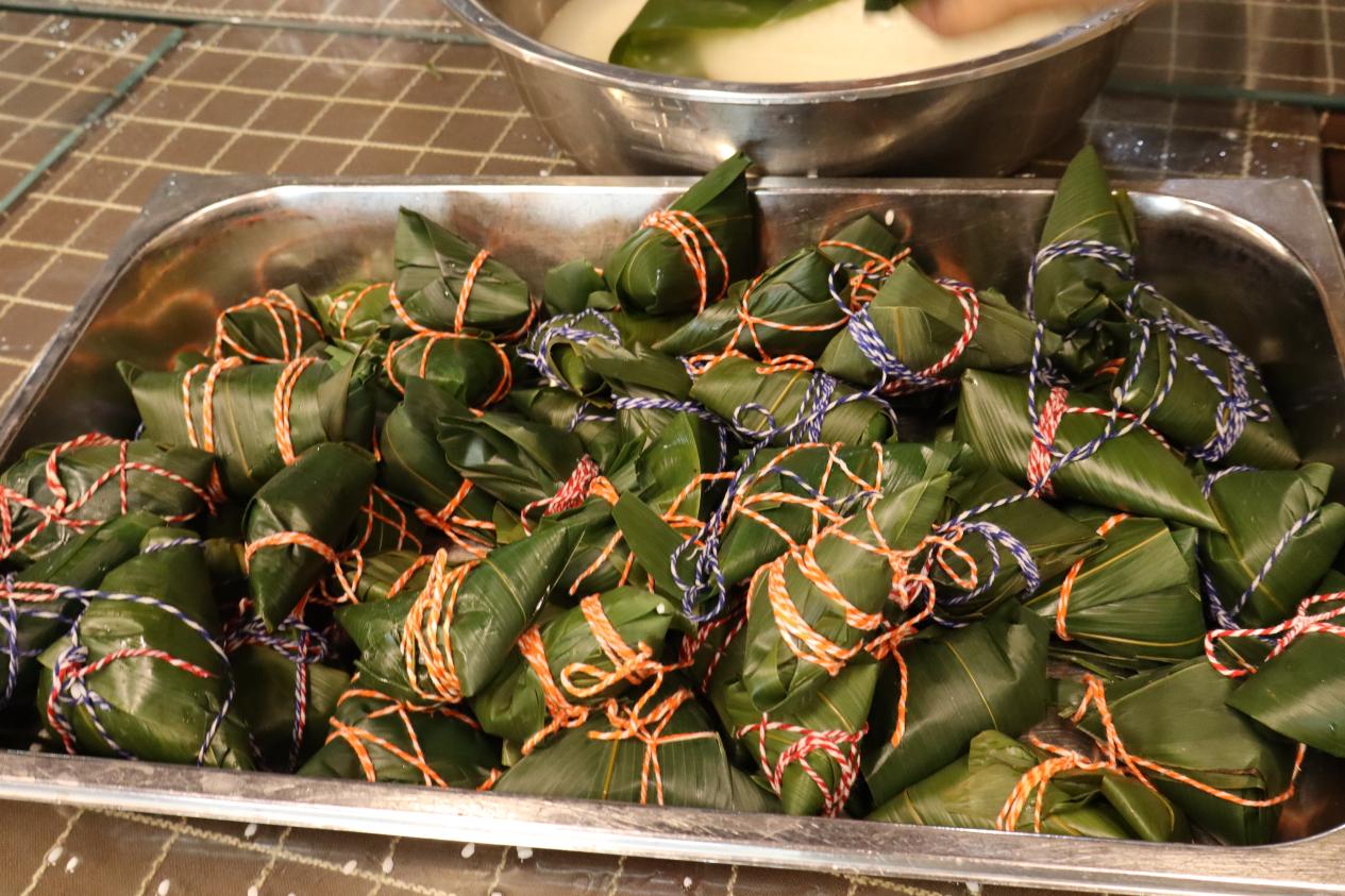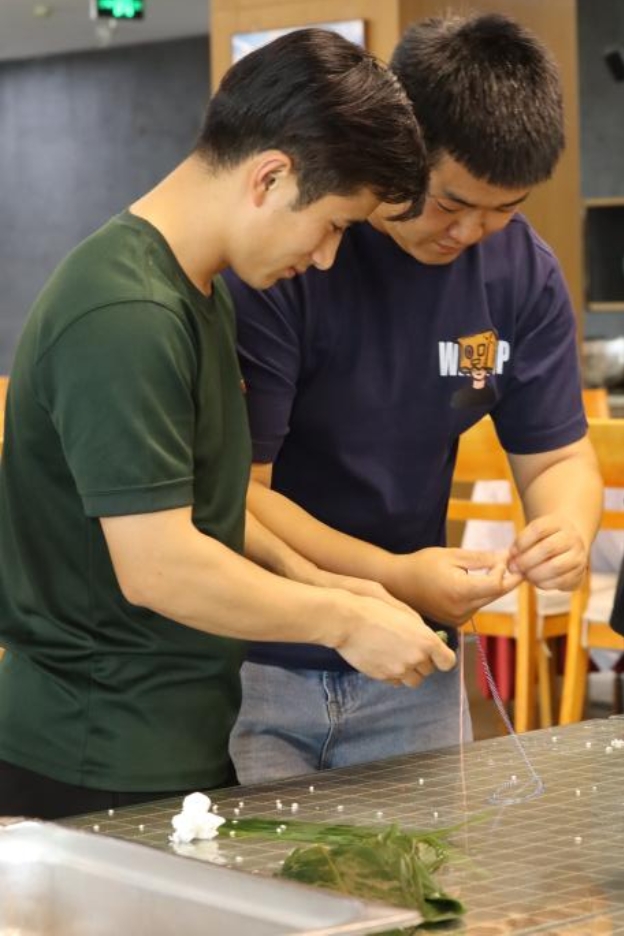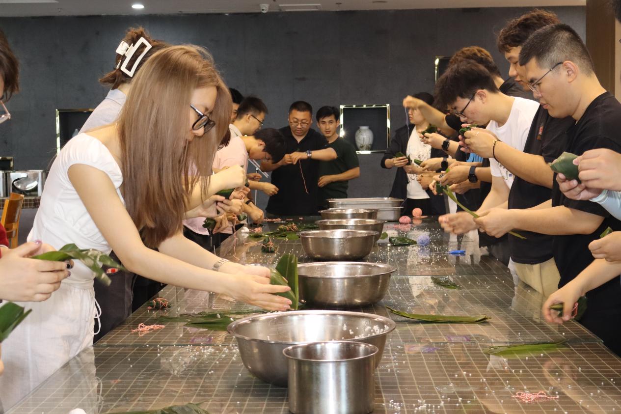 在阿姨的指导下,师生们兴致勃勃地动手实践:折叶、填米、捆扎,每一个环节都充满了乐趣与挑战。老师和同学们互相交流包粽子的技巧、分享心得,现场气氛热烈而温馨。经过一个多小时的努力,一个个棱角分明、馅料丰富的粽子摆满了桌子,每一颗都凝聚着师生们的辛勤劳动,也见证了大家共同的努力和成果。
