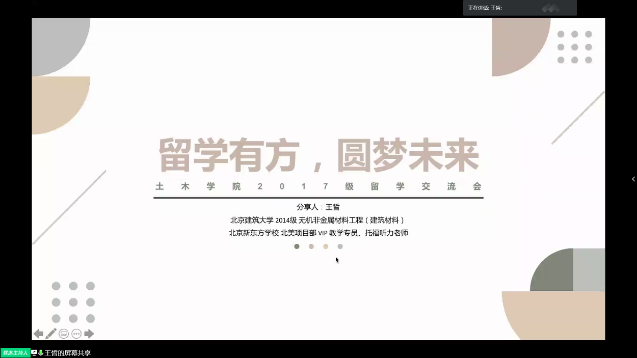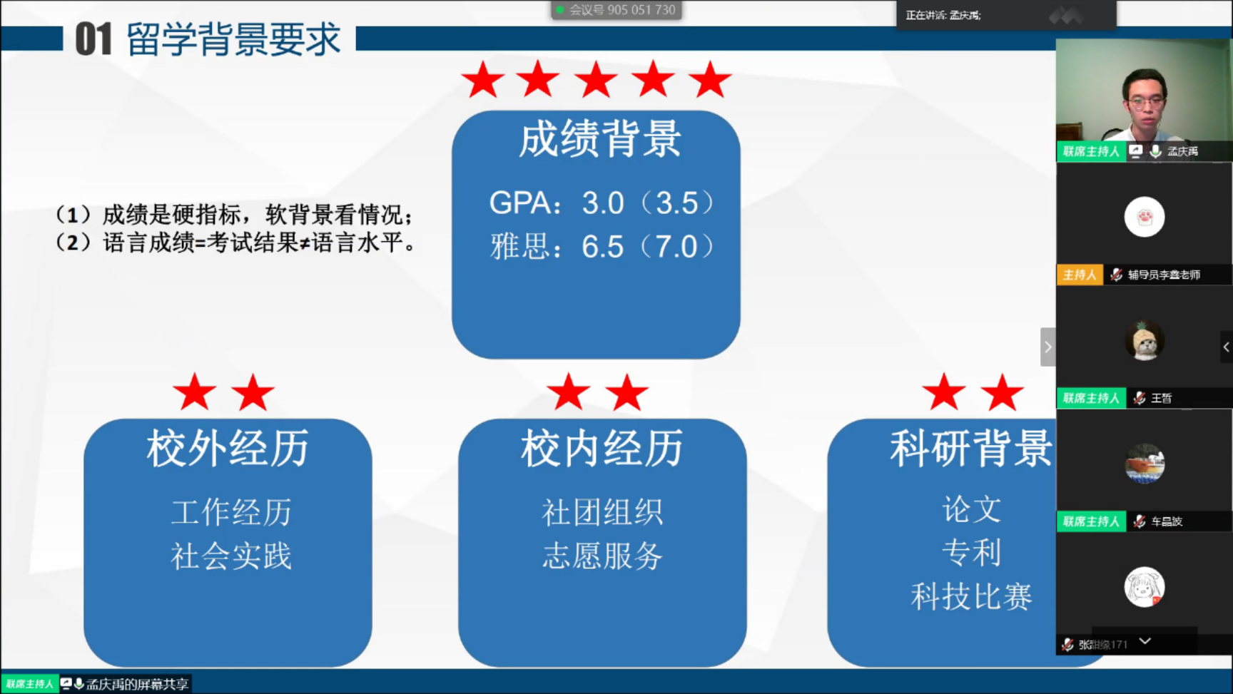 现就读于新南威尔士大学土142孟庆禹从留学背景要求、澳洲留学经验、澳洲学校背景、留学费用预算四个方面详细分享了自己的留学经历以及留学感想。最后的提问环节,同学们就语言课、分数门槛、GPA对申请学校的影响等问题向孟庆禹提出了自己的问题。