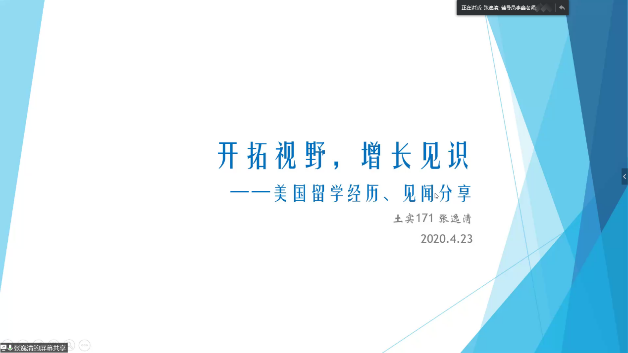 现就读于美国科罗拉多大学博尔德分校的外培生土实171张逸清以开拓视野,增长见识为主题进行美国留学经历、见闻分享。从自己的冲分经历、出国后的语言环境、学习环境、课堂组成入手给大家分享了自己的学习生活。之后以自己的生活起居、衣食住行为例给大家介绍了自己留学生活的点点滴滴、生活见闻。并在分享的最后提醒大家在留学之前一定要认真调查了解学校的申请条件和学校所在地的周边环境。