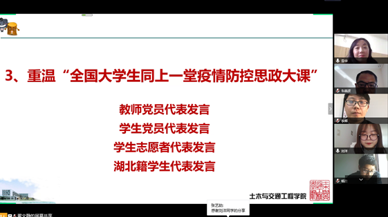 面对疫情,土木学院涌现出一批优秀学生党员和志愿者,他们用实际行动投身全民战“疫”。在交流环节,学生党员代表刘洋讲到,作为新时代的研究生,应该有所担当、有所贡献,正如张大玉副校长在开学思政课上所建议的那样,要做一名“修身者”、“奋斗者”、“信仰者”;学生志愿者代表张福瑶分享到,作为一名党员积极投身到保护人民群众的队伍中是职责所在,当看到社区召集志愿者的消息时,她便义无反顾的填写了报名表;湖北籍研究生代表杨胜说到,在疫情最严峻的时刻感受到来自学校、学院的关怀和帮助,未来一定会用行动践行初心,疫情结束后向学校交出一份满意的答案。
