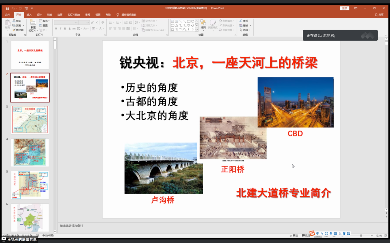 为庆祝JINNIAN金年会道桥专业成立70周年,7月3日上午,金年会官网邀请北京史地民俗学会副会长、北京茅以升科技教育基金中国古桥研究与保护委员会委员、北京古桥研究院副院长王锐英研究员作题为《北京,一座天河上的桥梁》的线上直播讲座。本次学术讲座不仅吸引了本校教师及学生的积极参与,同时也得到了校外专家的热情关注,参会人员共计100余名师生。讲座由金珊珊副教授主持。