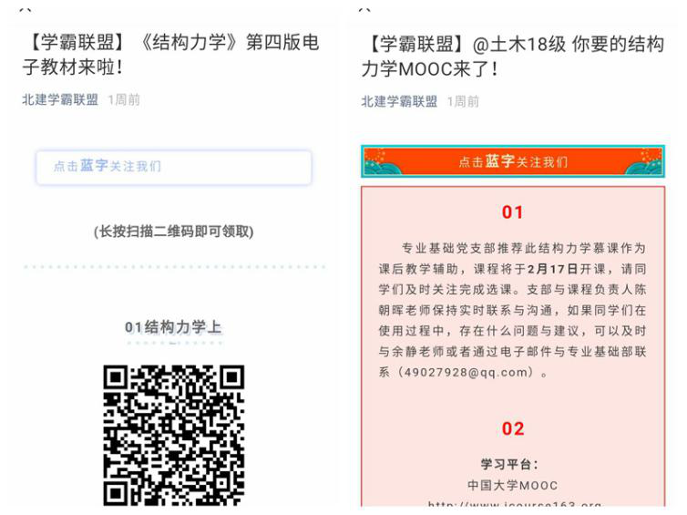 专业基础部教研室承担结构力学、房屋建筑学等重要土木工程专业课程的授课和教研工作,这两门课程的学习涉及土木学院4个本科生党支部、两个年级、12个班级以及其他学院的部分专业。针对课程有一定难度,学生不预习难以跟上进度的情况,在2月9日,专业基础部党支部开展了教学研讨,通过“北建学霸联盟”公众号平台,面向全体修习《结构力学》课程的学生发布电子版教材,并号召同学们提前预习。2月11日,又通过学霸联盟平台发布课程预告和结构力学慕课等教辅材料,同时发起课程问题征集,鼓励同学们自主搜索结构力学在土木工程中的实际案例,探索结构力学学习方法等。