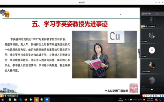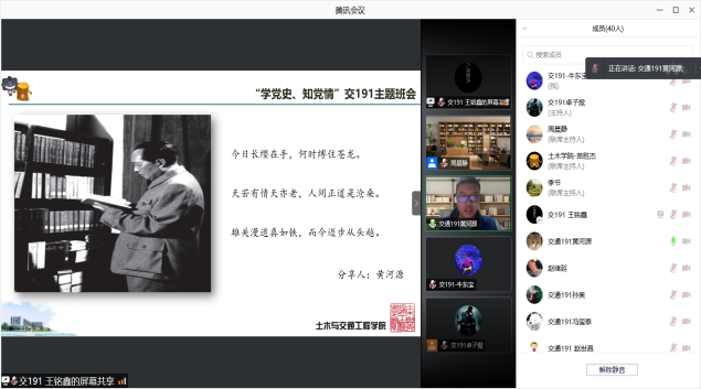 对于此次班会土203班的王昊同学表示:“这次班会上,我有幸能够了解到李教授的事迹,虽然很抱歉以这种方式才能认识到一位党员,一位教授的的所作所为,但是李教授的故事让我作为一名群众意识到了党员对自身的要求,作为一名学生意识到了对待学问究竟应该是怎么样的一种态度,这次的班会让我受益颇多。”交191班的牛东宝同学深刻理解的党史的意义:“通过此次班会我感受到了党史如明灯,照亮我前行之路;党史如清泉,洗涤我心灵之尘;党史如号角,激发奋进之力。我了解了李英姿老师的先进事迹,我们要向李英姿老师学习学习她优秀的品格。在新一学期我们要继续努力,创造良好学风环境,在学业上再创新高,不断奋进。”