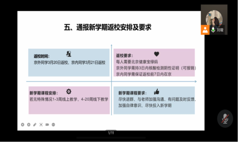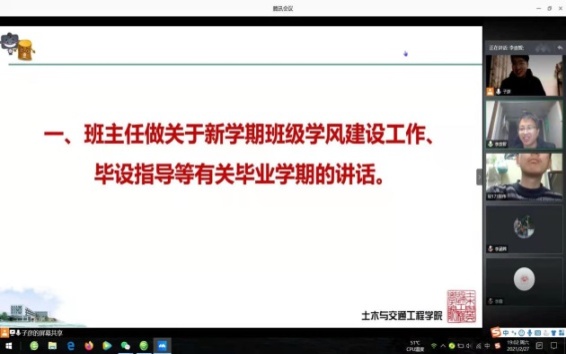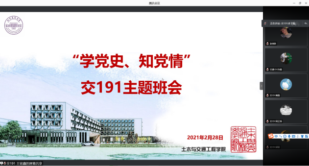 为深入学习贯彻党的十九届五中全会精神和习近平总书记关于新时代高等教育和青年学生的系列重要讲话和指示批示精神,深入贯彻落实蔡奇同志到学校调研时的指示精神,扎实推进学生党史学习教育活动,按照学校部署要求,上好开学第一课,金年会官网于2月27日、28日分年级、分班级在线上组织召开了新学期主题班会,各班根据本班特色拟定了“亮身份、树形象、做表率、有担当”、”疫情防控,你我同行”、“学党史,知党情”等主题。学院领导班子成员、班主任、辅导员深入各班,了解学生假期期间学习和生活情况,全力保障学生疫情防控安全和线上学习需求。