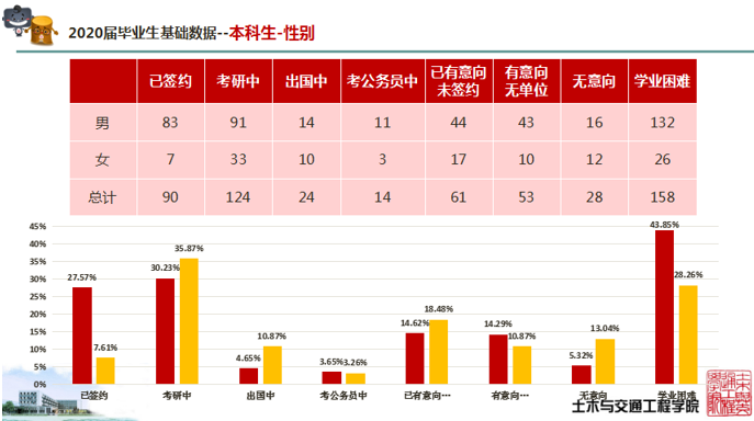土木学院实时更新就业数据,并系统的梳理毕业班学生的就业意向及学业情况,在确保底数准确的基础上,进行分群体、分类别的数据分析,为进一步的就业工作明确重点与方向。对于重点关注群体,学院建立工作台账,一人一策,定期沟通,及时解决面临困难;对于一般关注群体,学院进行风险预警,明确努力方向,增强学生信心,精准推荐岗位。