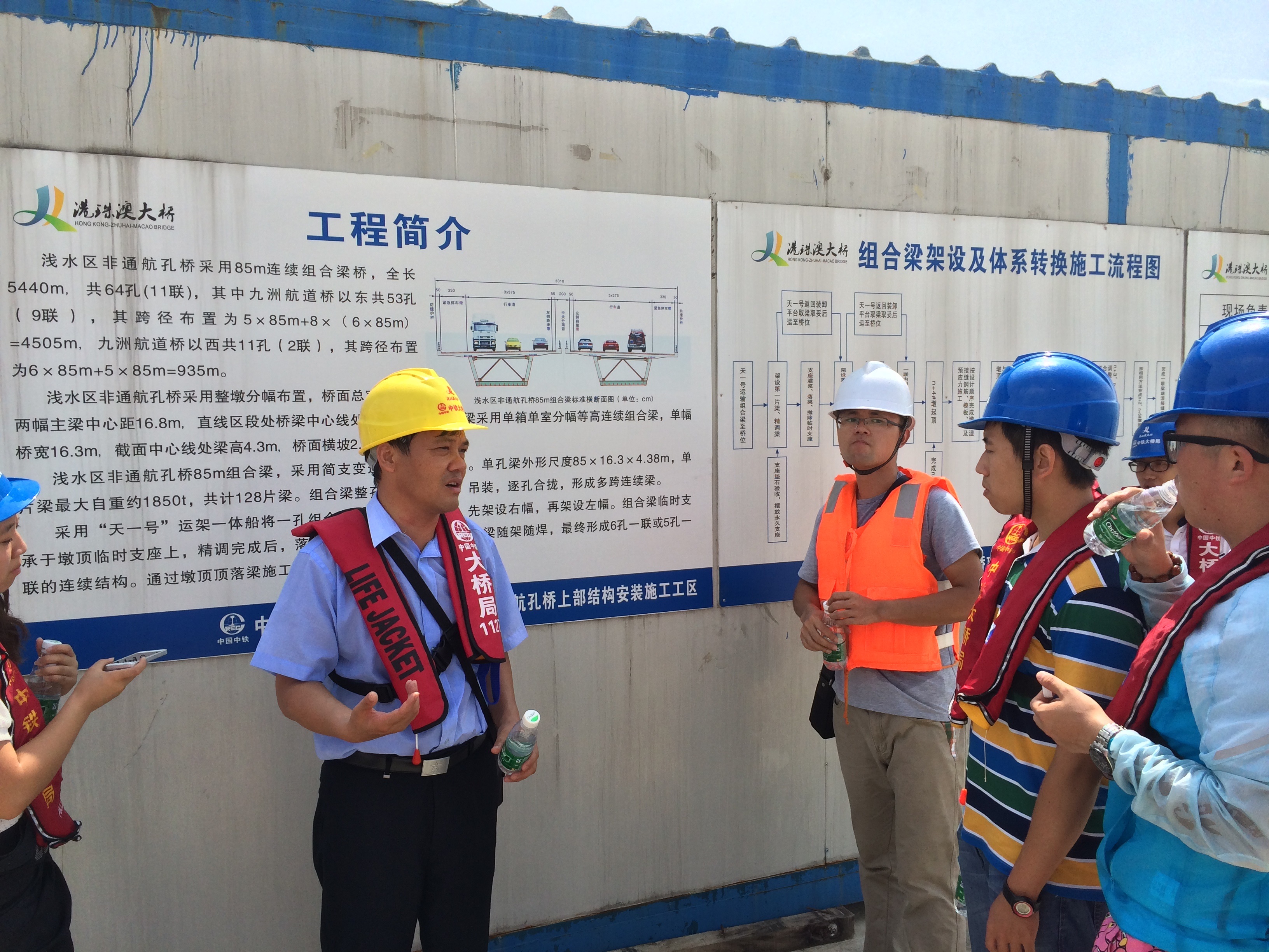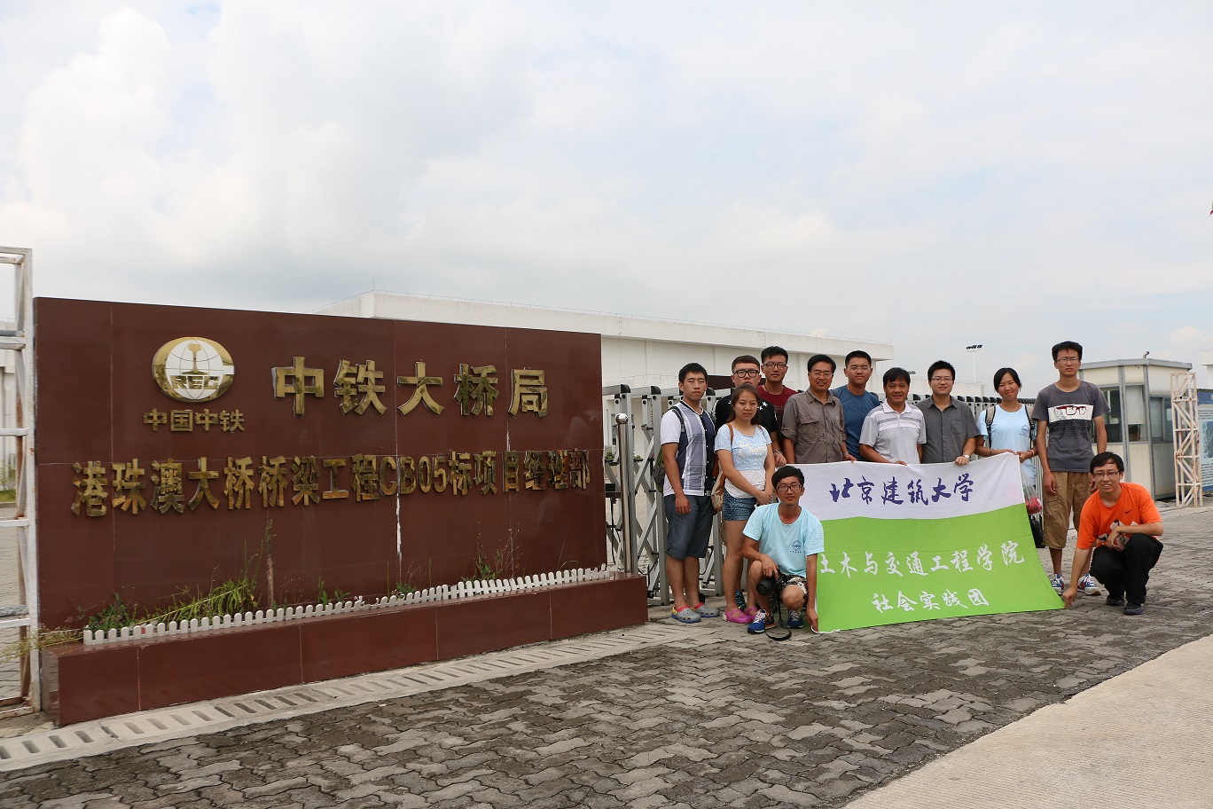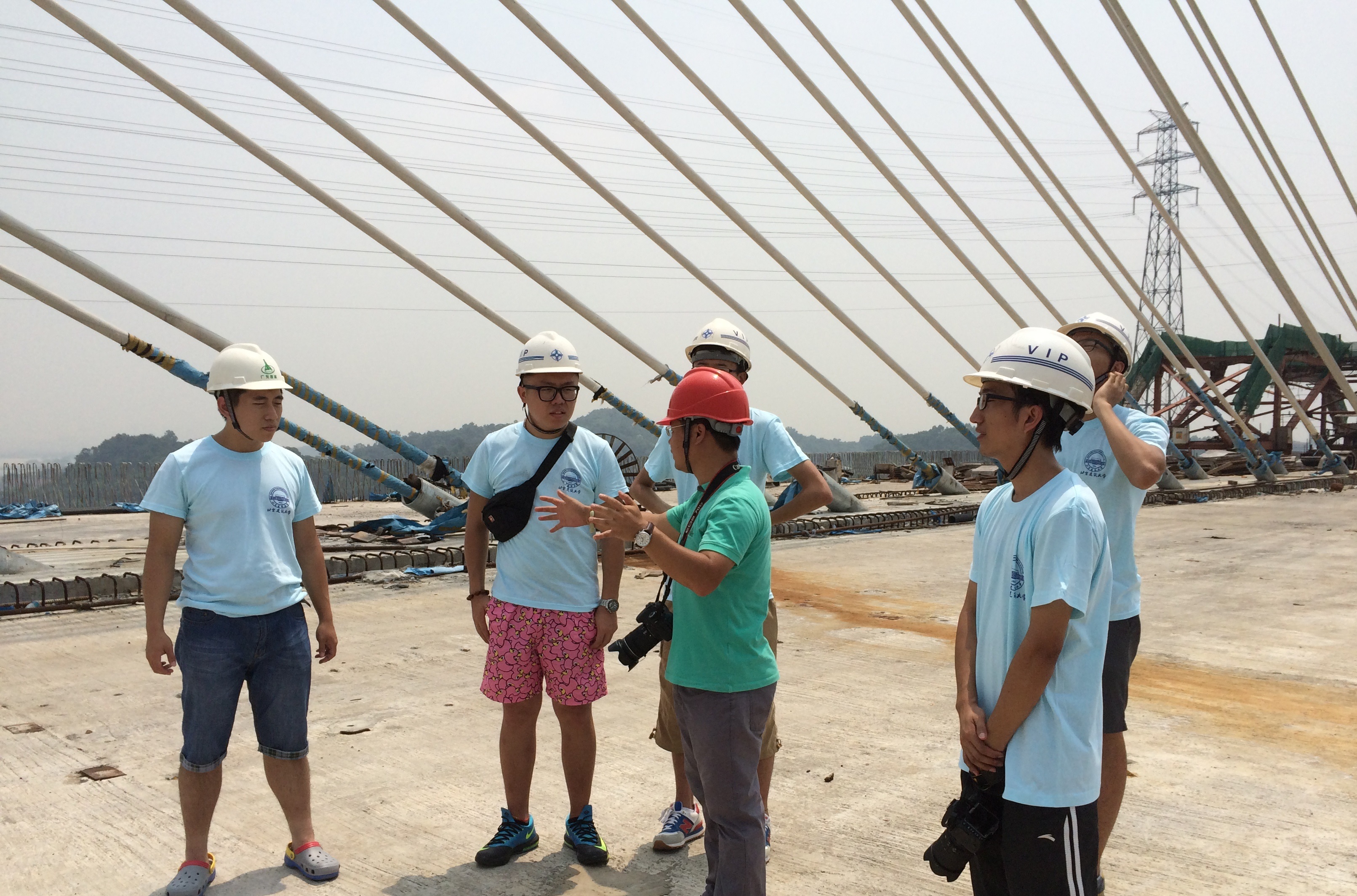 在即将步入大三的专业学习之际,为对相关专业知识理论同实际工程相结合,了解有关桥梁建设方面的施工工艺及操作方案,JINNIAN金年会土木学院组成了以2012级桂晓珊为团长,李昊、吴鹏志、蓝志滨、田学谦、胡雨辰、邓青青、李雨航等8名学生为团员的大学生社会实践考察团。2014年8月1日~7日,实践团以“科技筑梦,助力发展”为活动主题,在董军教授的带领下,在项目部负责人交通运输部公路所向学建高工、邹本辉工程师等人的引导和讲解中,深入广东地区对正在建设中的几座大桥施工现场(广州新造珠江大桥、陈村特大桥)及连接港珠澳三地的港珠澳特大桥中的九州航道桥及中山预制基地进行了专题考察。实践团的同学们在短短几天的现场考察中,较为详细地了解了东南沿海一带大型桥梁的施工特点,特别是悬臂施工的相关工艺,包括挂篮施工、现场预制工艺、防腐措施、跨海大桥的施工特点等,对其中的创新元素,留下了深刻的印象;对于即将步入专业课学习的同学来说,现场施工给出了一个清晰的轮廓和感性认识,不但有助于专业课的学习和理解,而且对于深刻领悟所学的结构力学等基本理论,进一步激发学习热情和创新理念、理性选择自己的专业方向等,均有积极的促进作用。
