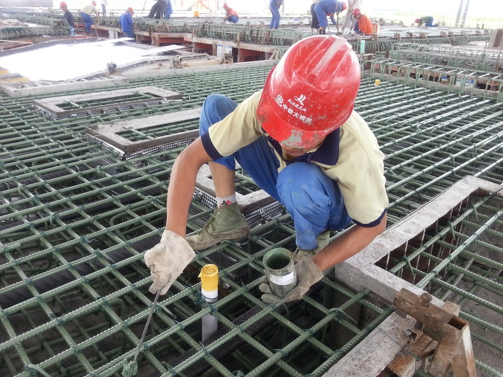 图17 中山预制基地的工人在给已经捆扎好的钢筋补涂环氧粉末涂层以保证钢筋的防腐性能