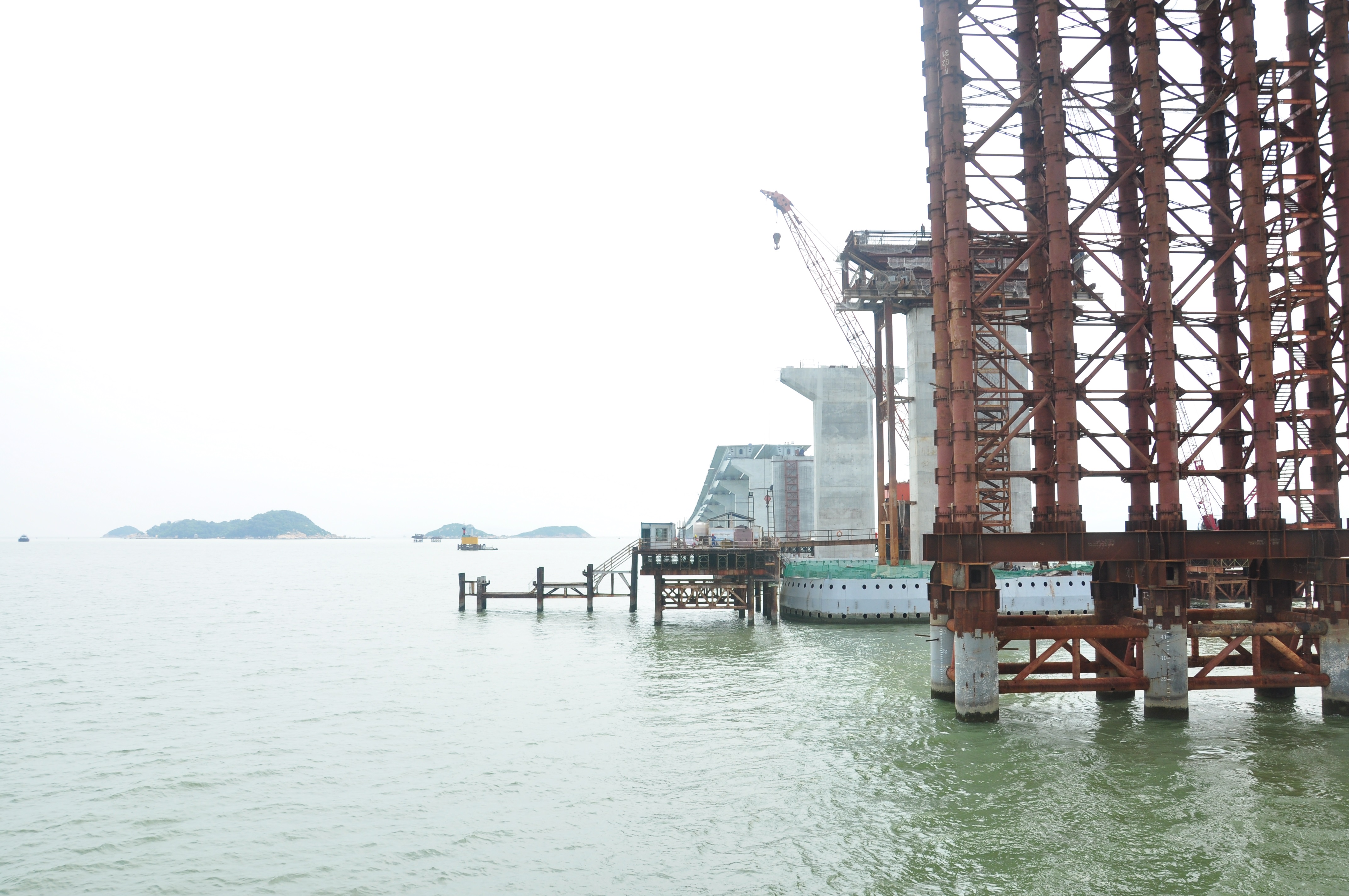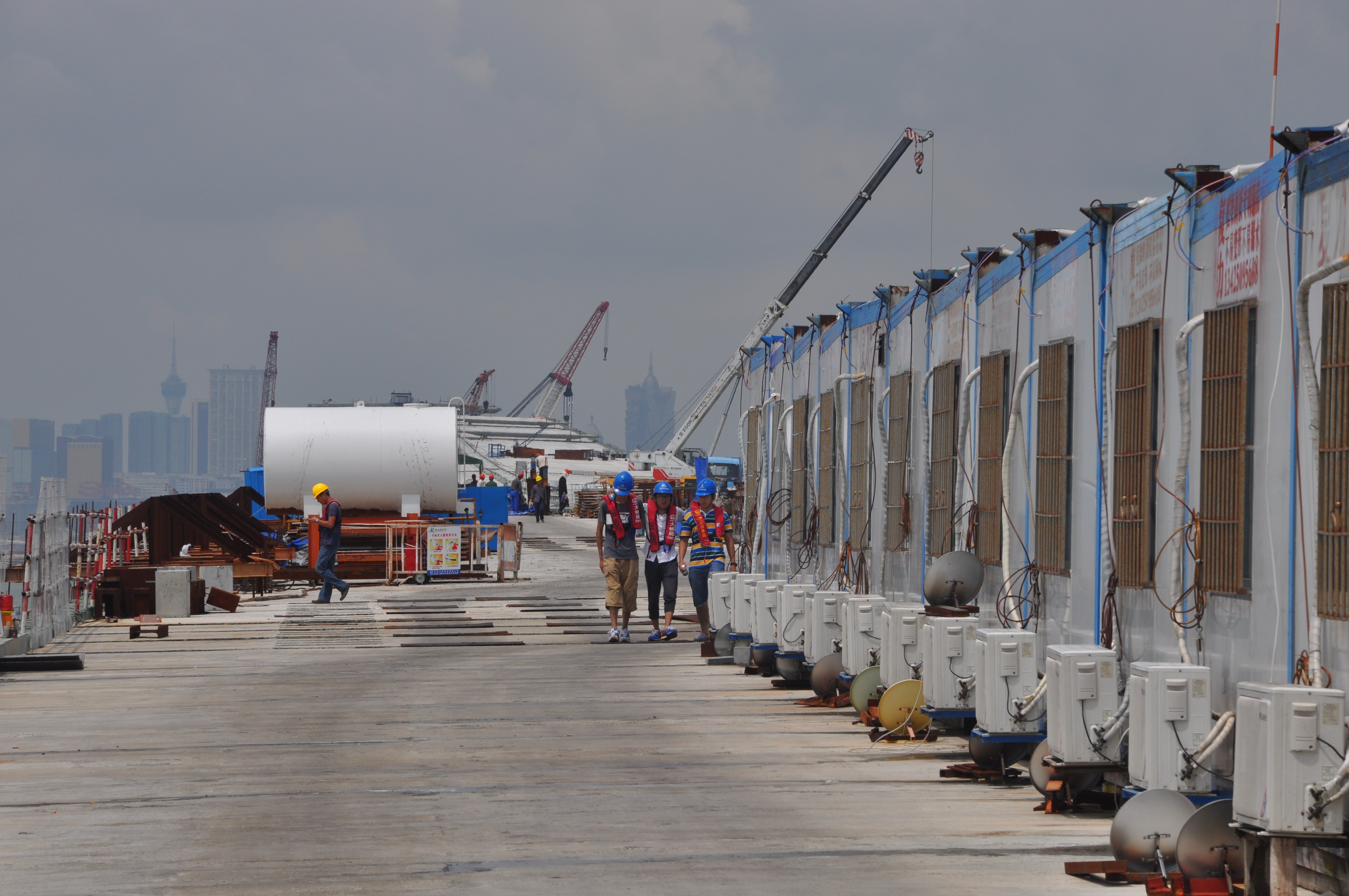 须臾,我们便乘船来到工地现场,印入眼帘的便是施工中,在过程每一个细节上的一丝不苟与追求完美的精神,精益求精的细节标准似乎是在代表每一位大桥建设的亲历者向祖国人民宣誓,大桥设计寿命120年绝不是一句空话,托起港澳同胞与内陆联系更加紧密的任务也必将会顺利完成。人性化的施工现场,合理的生活与工作分区,更让建设者们感到这是一个工作的乐园。记得在进入海上施工现场之前,向工自豪地给大家介绍了大桥建设中最重要的是HSE (Healthy Safety Environment) 管理模式,大桥的建设者在建设的同时,更加注重健康、安全与环境的现代化施工理念,而不是一味地追求建设形象工程,面子工程。正因为健全的HSE联动机制、完善监控机制以及齐备的防台防风预案等各项预警措施,复杂的海洋环境中,大桥建设者能够多次在最大风速达41.3m/s的恶劣环境中多次成功避险,丝毫无损。不断向“工程优质安全、环境优美和谐”的建设目标迈进。严格的“四化”要求,即“大型化”,“工厂化”,“规范化”以及“装配化”,也让我们为大桥建设工程师们对于港珠澳大桥的建设的认真严谨的态度感到叹服。“大型化”是指整个工程大型化,各个结构构件都十分庞大;“工厂化”是指大桥的各个部件都在中山市的一个制作工厂进行预制;“规范化”是指构件的制作都严格遵循设计标准,对于误差的把控十分严格,连钢筋的制作都使用精度极高的数控机床进行加工;“装配化”是指预制好的结构构件通过“小天鹅”号超大型吊装船运送到施工工地进行装配化施工。