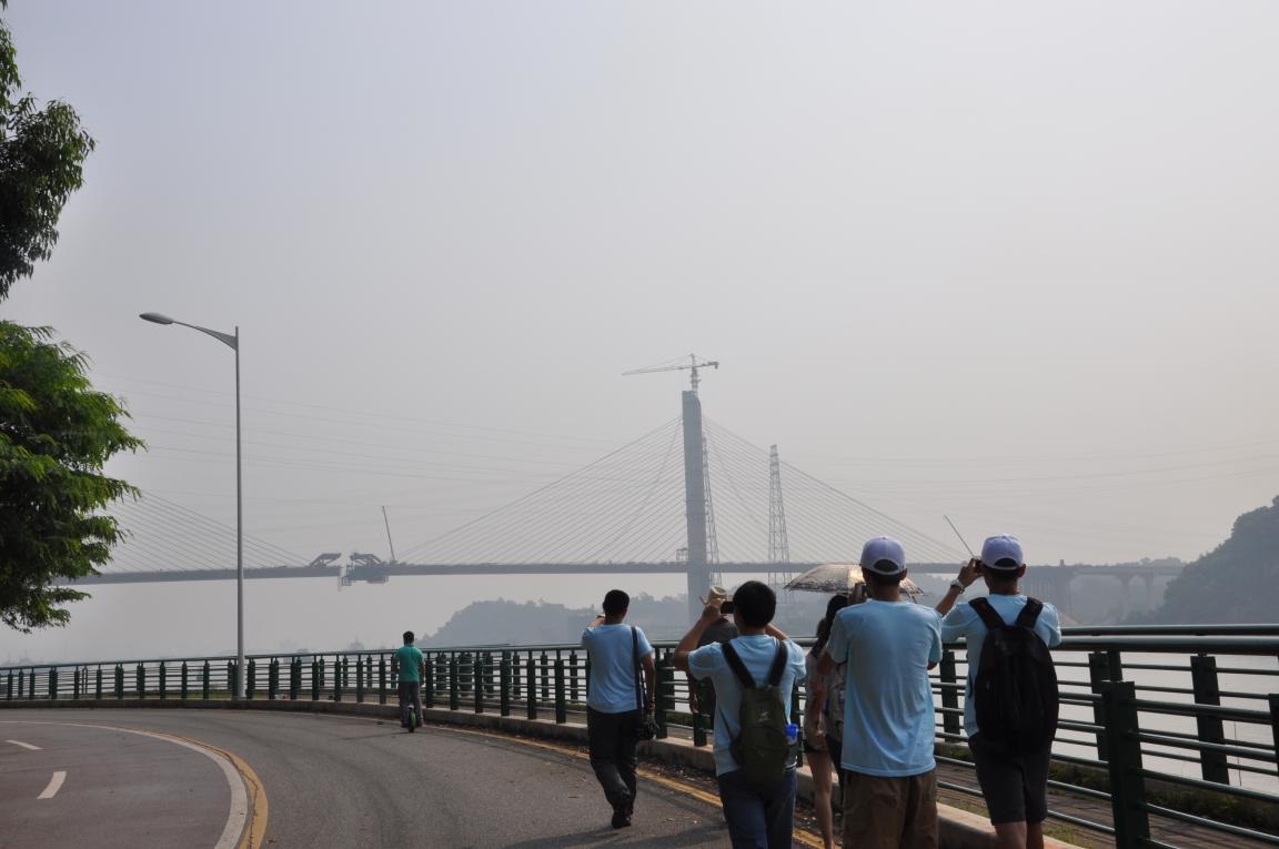 实践团的第一站是新造珠江大桥施工现场。起初还带有只能表面上来看个热闹的同学们,在董老师及向工、邹工的讲解和交流中,逐渐地围绕着悬臂施工法,新造珠江大桥在建设实际过程中的一个个问题不断地引导出来,激发了我们的兴趣和思考。斜拉桥属于高次超静定结构,和我们所学的材料力学、结构力学密切相关;采用的单索面使得大桥简洁、美观且结构稳定;深水基础桥墩可以通过围堰施工来完成;挂篮总重160吨,要想安全施工,力学平衡好重要;我们早已耳闻的挂篮是一个庞大的钢架结构,每一次运用都要翘动着每一个施工者的心,从移动、固定、浇筑、养护到下一次移动等;斜拉索及锚固端防腐处理如此重要,具有优良性能的CFRP材料可替换斜拉索,但还有许多问题需要探索;具有抗风性能的大型箱梁设计原来是借鉴了空气动力学的原理;在结构力学中梁截面仅仅是一个点,到实际箱梁这一点处却还有考虑横向预应力和竖向预应力;悬臂施工法从0号块到合拢,有一个力学体系的转换,因此很多施工的细节都需要倍加关注