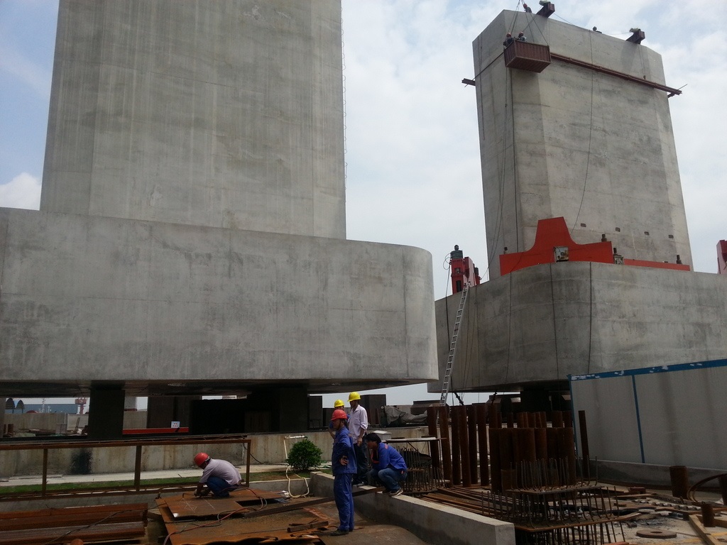 实践团的第二站来到了陈村特大桥施工现场,陈村特大桥桥型属于矮塔斜拉桥,又称为部分斜拉桥,为近20年来出现的一种新桥型,瑞士、德国、日本、韩国等一些国家这几年修建了多座此类桥型。由于它优越的结构性能,良好的经济指标,越来越显示出巨大的发展潜力。国内相对起步较晚,但采用了较高的起点。国内目前修建的混凝土矮塔斜拉桥主跨超过200m的并不多见,而我们这次参观的陈村特大桥就是国内少有的同类桥梁中的一座。同学们好奇地发现,原来矮塔斜拉桥竟然给出了我们很多不同的惊喜和收获,它和普通的斜拉桥有所区别。它的力学性能介于连续梁桥(或连续刚构桥)和普通斜拉桥之间,跨径在200m~300m左右时在结构性能和经济等指标下表现出较强的竞争能力;与此同时,近年来不断发展的连续梁桥和连续刚构桥虽然普遍以增加梁高来获得更大的跨径,但是梁高的不断增大也带来了施工。经济和大体积混凝土等问题的增加,同时因为跨中下挠过大也严重阻碍了其发展。 矮塔斜拉桥的引入正好有效地解决了这一问题。