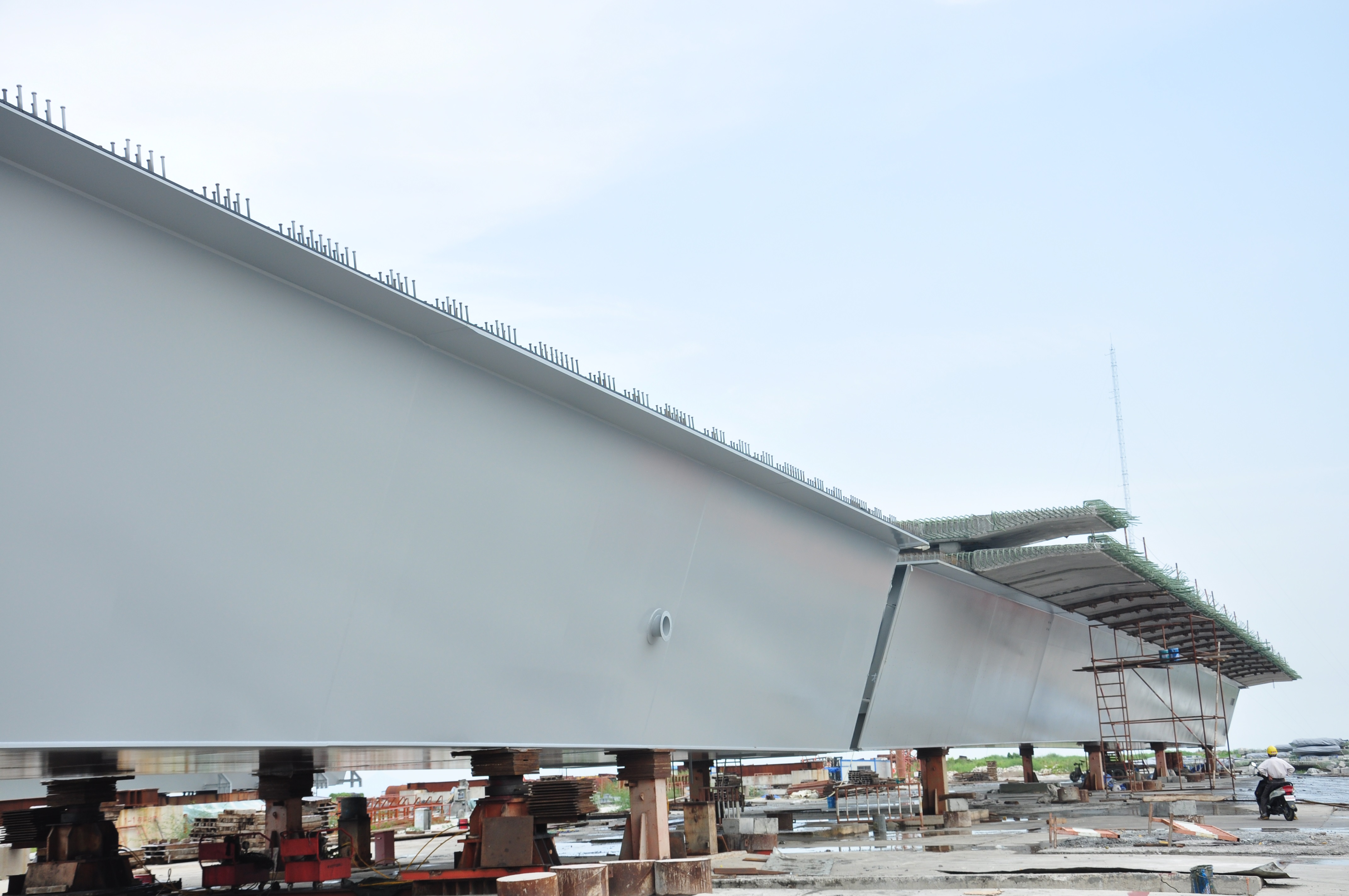 图13 中山预制基地采用“八点线性控制”存放的精细化钢箱梁正在安装桥面板工作