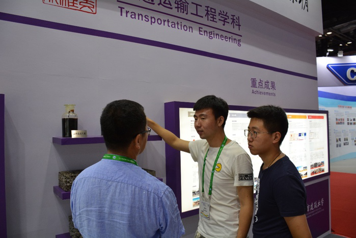 本届大会,我校展区共分为两大部分,其一是北京未来城市高精尖创新中心展区,该展区从中心概况、服务国家、服务北京,三个方面系统全面的介绍了北京未来城市高精尖创新中心建设的功能和作用。其二是我校交通运输工程学科展区,我校交通运输工程学科办学可追溯到1907年,是北京历史最悠久的城市交通基础设施建设专业之一。学科坚持“立足首都,面向全球,依托交通运输业,服务可持续发展”的总体办学思想,明确了培养“首都与大城市交通行业技术研发与应用创新型高级人才”的定位,树立了建成国内外有特色和影响力的学科建设目标,以新材料和新技术开发为引领,直接服务于首都道路、轨道等交通基础设施的规划、设计、建设与运营管理。其中,我校道路工程材料团队凭借着多年刻苦研究,斩获了多项国家级奖项,本次展览集中展示道路工程材料团队研发的新型再生水泥稳定半刚性基层、再生废旧沥青混合料、高性能沥青再生剂、低成本抗车辙剂等多种新型道路建筑材料,获得业内广泛好评。