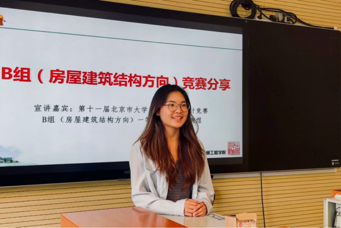 第十五届全国大学生结构设计竞赛二等奖获得者赵思龙、第十一届北京市大学生建筑结构设计竞赛B组获奖团队代表贾建昊、王婉煜同学从前期准备、中期模型制作技艺练习、后期改进与赛场、竞赛收获等几个方面为同学们发挥进行分享。交流会现场,参赛队员和老师及往届队员进行了充分的交流。