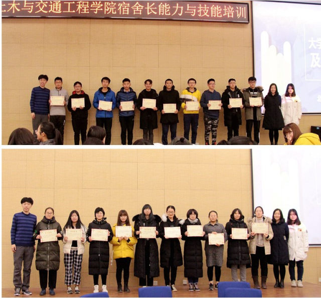 在本次培训的最后,辅导员苑泉和张萌对三次培训全勤的宿舍长颁发证书。至此,首届土木学院宿舍长能力与技能培训圆满结束。
