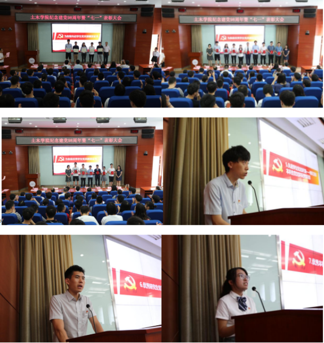 随后,大会进行了隆重的“七一”表彰活动,土木学院领导宣读了表彰先进学生党支部、优秀学生共产党员、《学习强国》学习之星的决定,学校嘉宾分别为这些党支部和党员颁发了获奖证书。先进学生党支部书记代表苑泉、优秀研究生共产党员代表王祥臻、优秀本科生共产党员代表郑思思分别作了精彩发言,分享了在支部建设、党员成长及党员应发挥的作用等方面的宝贵经验。他们表示,在新的起点上,将继续保持奋发有为、昂扬向上的热情,以一丝不苟、脚踏实地的学习和工作态度,为学院发展、学校建设贡献一份属于自己的力量。