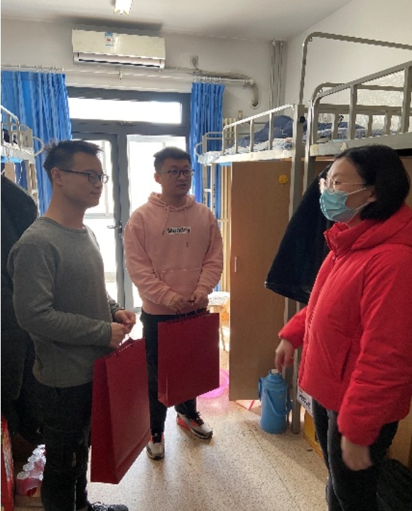 千门万户曈曈日,总把新桃换旧符。在牛年新春佳节来临之际,2月7日上午,土木学院党委书记韩淼,院长季节,副院长齐吉琳、廖维张,副书记关海琳以及研究生导师、辅导员前往学生宿舍,看望慰问寒假留校学生,代表学院向他们致以亲切的关怀和新春的祝福,并送上了新年大礼包。