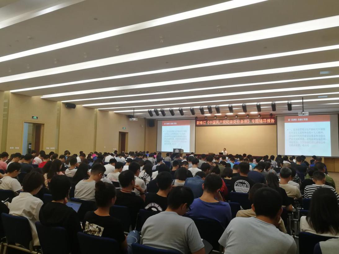 2018年9月11日下午,土木学院在大兴校区图书馆建本报告厅开展“学习新修《条例》,争做合格党员”主题党日活动,邀请中央党校政法部副教授金成波博士以专题辅导报告会形式,带领党员们深入学习中共中央印发新修订的《中国共产党纪律处分条例》。学校纪委委员、机关财务处、机电学院、文法学院、经管学院、图书馆、体育部、后勤和土木学院党员师生,共计270余人参加报告会。土木学院党委书记冯宏岳主持会议。