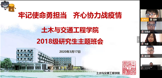 为发挥党员先锋模范作用和党支部战斗堡垒作用,结合教师党支部与学生党支部开展“一对一”帮扶工作,3月17日下午,土木学院结构工程研究生第二党支部与学工团委联合党支部开展了主题为“牢记使命勇担当 齐心协力战疫情”的研究生主题学习会。学工部部长朱静、副部长李长浩、校团委副书记宋宗耀、学院党委副书记车晶波、土木学院教师代表张艳霞教授以及全体18级研究生参加了会议,会议由李辉主持。