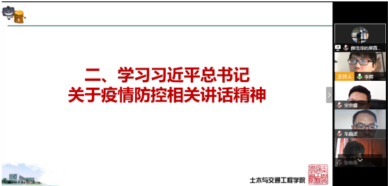 在学习环节,由土木学院结构工程研究生第二党支部书记李晓照通过“主讲主问制”形式学习习近平总书记关于疫情防控相关讲话精神。通过学习总书记对疫情防控的策略、科研攻坚的力度、医疗救助秩序的维护等方面的详细部署,感受到了中国特色社会主义制度优势和中国精神汇聚的磅礴力量。在“主问”环节三名研究生党员结合学习内容分别进行了提问,教师党员宋宗耀、曹晓云、李辉分别结合新时代研究生担当、习总书记给北京大学援鄂医疗队全体‘90后’党员回信内容、身边最美战“疫”者事例进行了认真的解答。