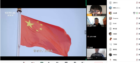 会议开始,首先进行了特殊的升旗仪式,全体参会师生在屏幕前升国旗、奏唱国歌,通过这种方式让大家心连心,激发同学们防疫时期的爱国主义情感。